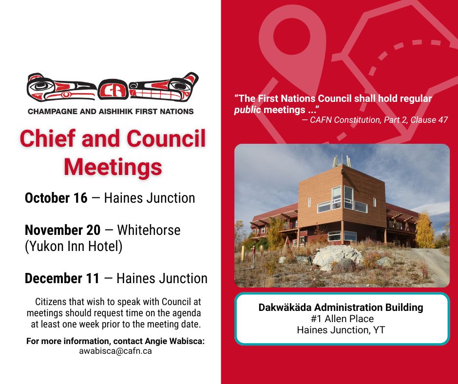 Champagne and Aishihik First Nations is seeking to fill the following positions to serve a community meeting in Takhini on Dec. 4: