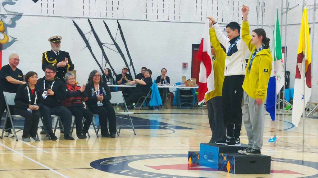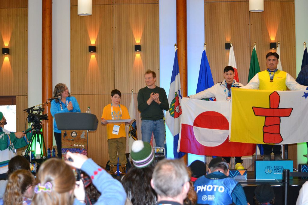 Chief Joe helped to honour Arctic Sports athletes at the medal ceremony, presenting awards for for achievement in incredible feats like the One-Foot and Two-Foot High Kick, Kneel Jump, and more—celebrating northern strength, endurance, and community on the Arctic Winter Games stage.