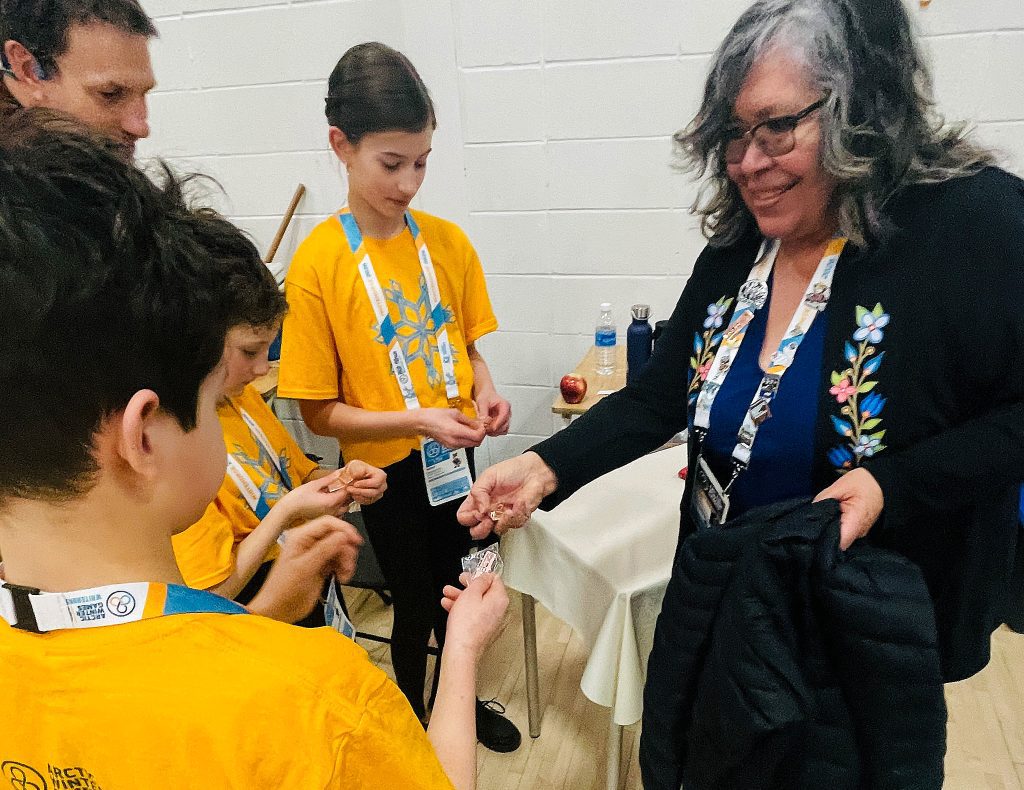 Chief Joe joins in one of the Arctic Winter Games’ most beloved traditions, pin trading, sharing stories and laughter with young volunteers as they swap tiny pieces of artwork that connect regions, generations, and cultures across the North.