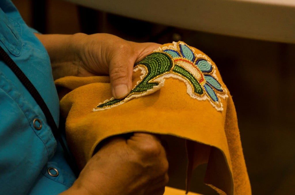 The Gúyàt (beads) exhibit was our first exhibit. Gúyàt showcased the exquisite beauty and detail of the Champagne and Aishihik beadwork tradition. The exhibit featured a range of handmade items decorated with beads: slippers (moccasins), mukluks, puberty hood, coats, vests, gun scabbards, gloves, purses as well as smaller items.