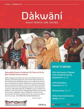 The Dàkwäni (What they say) newsletter is CAFN’s quarterly update for Citizens on a full range of activities at CAFN. Newsletters are printed in spring, summer, fall and winter and mailed or delivered to CAFN households all over Canada and are also shared on this website.